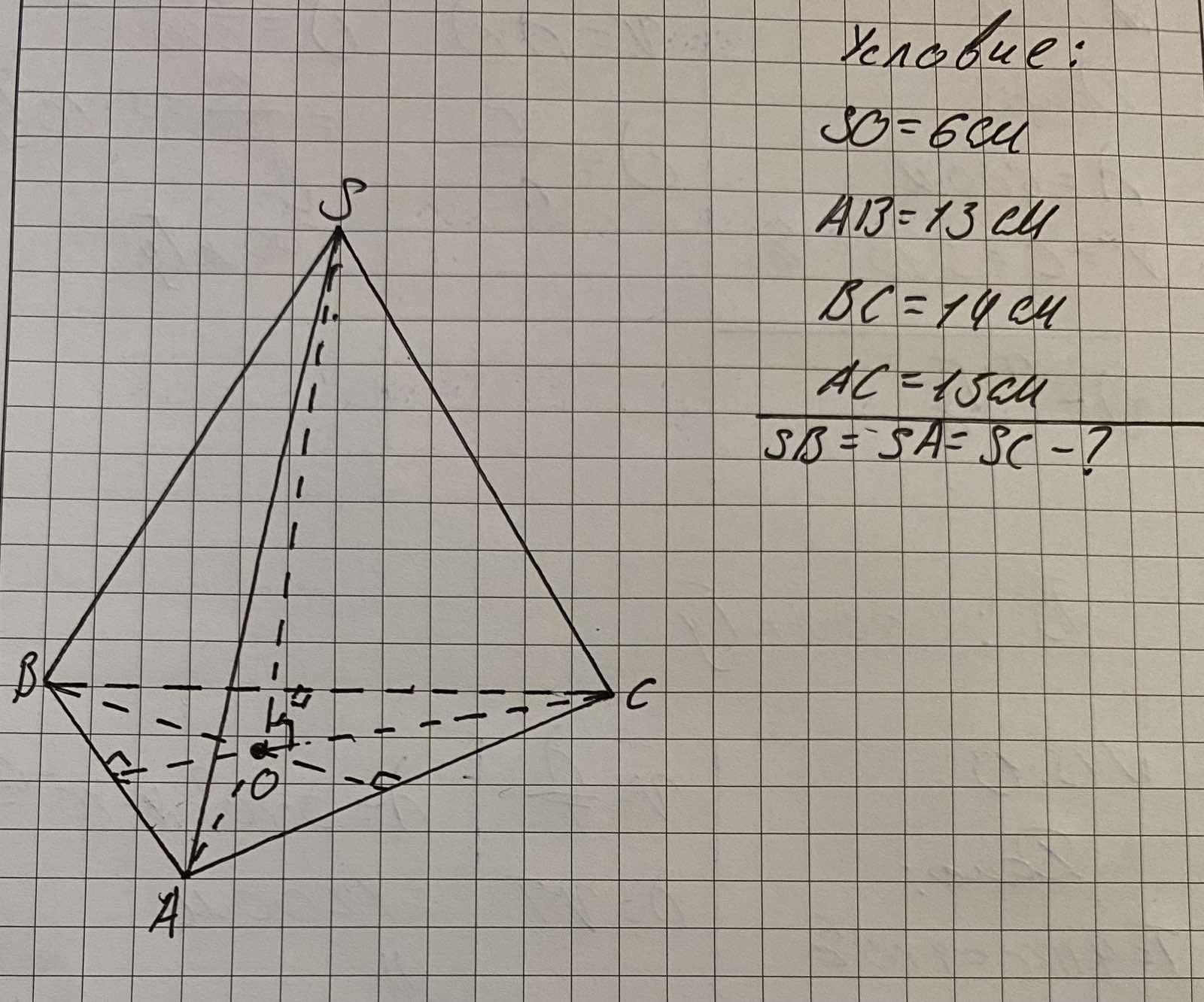 SO- расстояние от точки S до плоскости ΔABC, то есть это опущений перпендикуляр в центр треугольника. Центр треугольника лежит на пересечении серединных перпендикуляров.