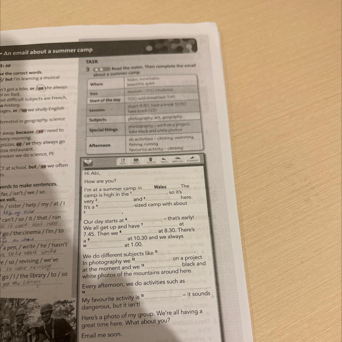 1. Mountain 2. Beautiful 3. Quiet 4. Medium 5. 200 students 6. Seven o'clock 7. Breakfast 8. Start lessons 9.Break 10. Have lunch 11.photography 12.work. 13.take 14.climbing swimming fishing and running 15.climbing