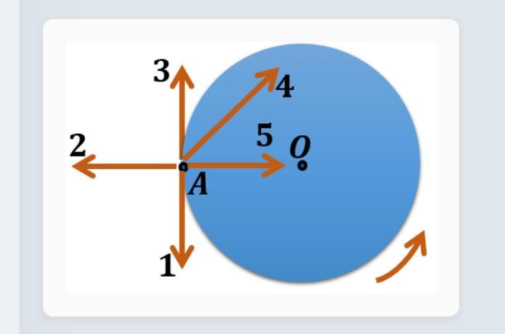 Диск равномерно вращается вокруг оси, проходящей через его центр – точка О. Определите направление вектора линейной скорости точки А из представленных вариантов 1 – 5.