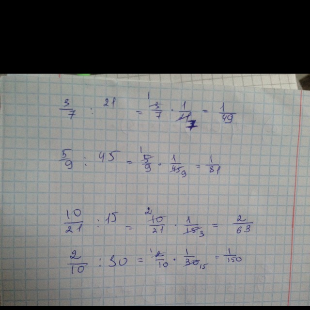 3/7:21 = 1/7*7=1/49 5/9:45=1/5*5=1/25 10/21:15=2/21*3=2/63 2/10:30=1/5*30=1/150