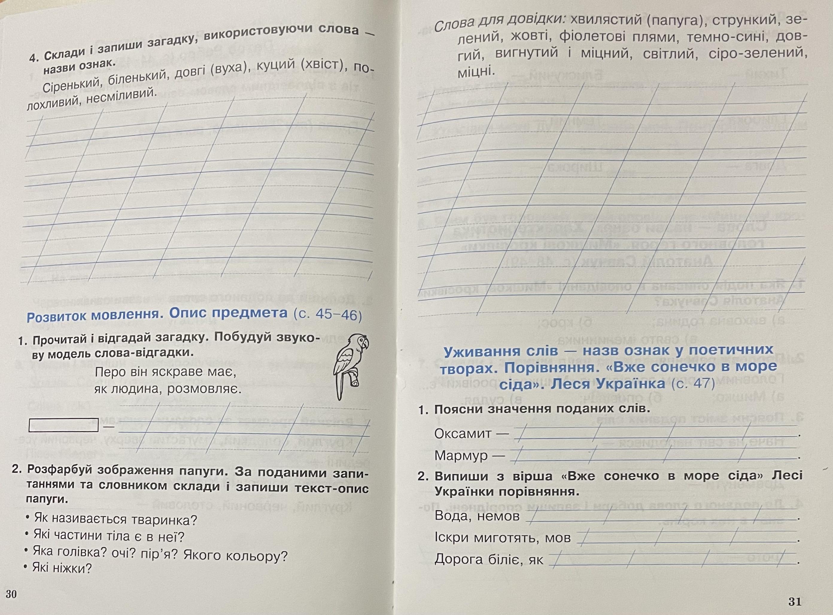 Які частини тіла є? Дзьоб, ніздрі, лоб, махові крила, спина, вуха, потилиця, очі, груди, горло, живіт, кігті, пальці, лапки, хвостові крила і так далі.