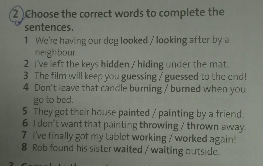 Choose the correct words to complete the sentences. 1 We're having our dog looked/looking after by a neighbour. 2 I've left the keys hidden / hiding under the mat. 3 The film will keep you guessing / guessed to the end! 4 Don't leave that candle burning / burned when you go to bed. 5 They got their house painted / painting by a friend. 6 I don't want that painting throwing / thrown away. 7 I've finally got my tablet working/worked again! 8 Rob found his sister waited / waiting outside. 5