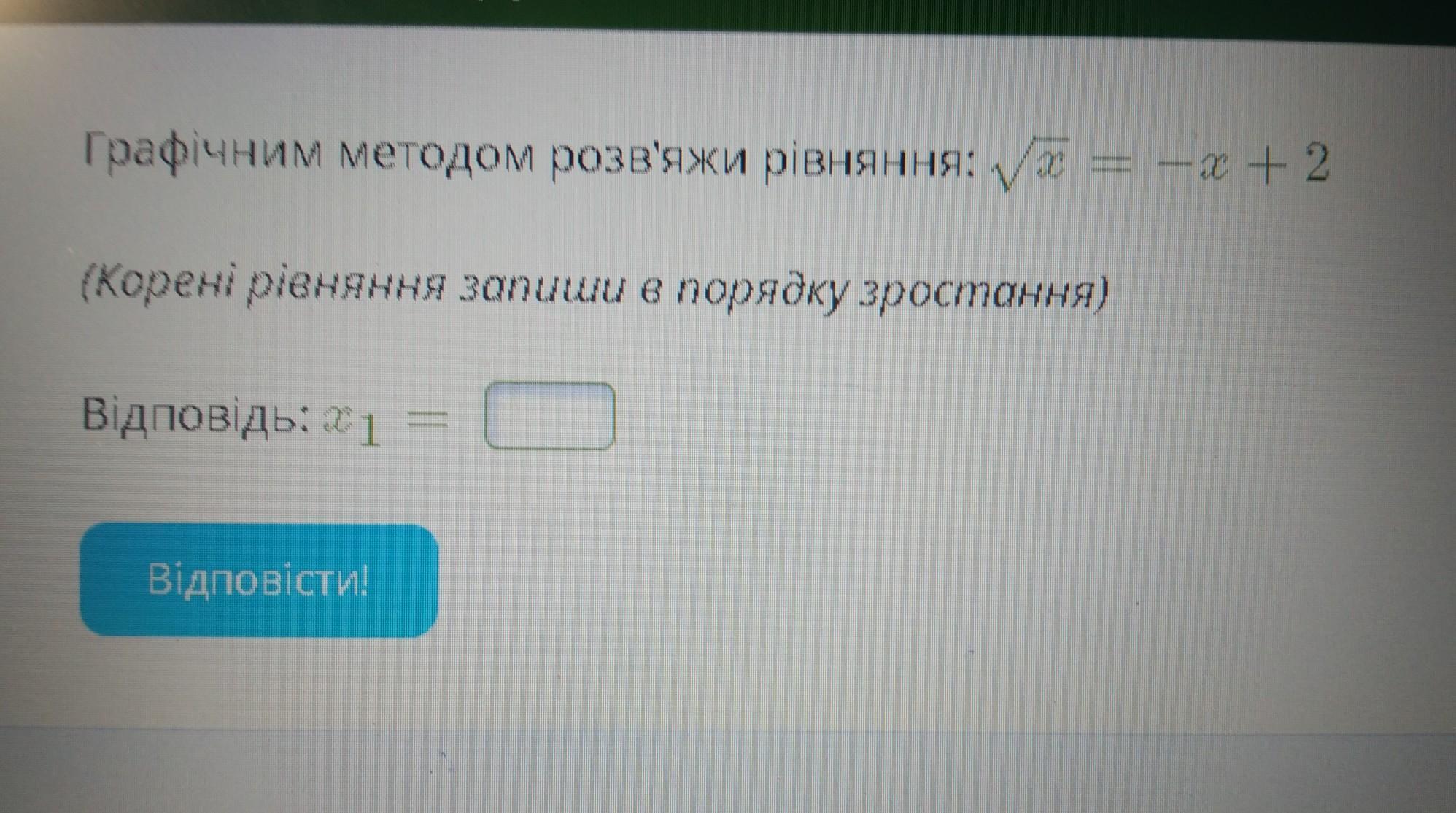 Графiчним методом розв'яжи (Коренi рiвняння запиши в порядку зростання) ВIДПОВIДЬ: рiвняння:/x=-x+2