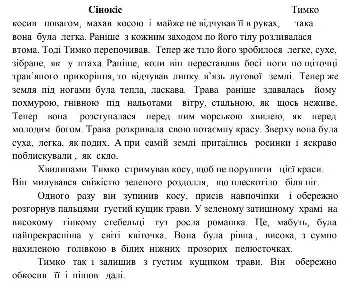 Тимко повільно косив траву, відчуваючи, яка його коса легка. Раніше він через деякий час відпочивав, потім знову косив. Бачив, яка трава красива, ніжна та легка, а земля тепла. Раніше здавалося, що все похмуре. І сінокіс на трішечки зупиняв косу, щоб помилуватися.