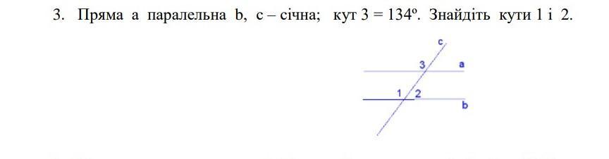 кут 3 та 1 відповідні кути, отже їх сума = 180 градусів. 180-134=46. внутрішні різносторонні кути рівні, отже, 1=2.