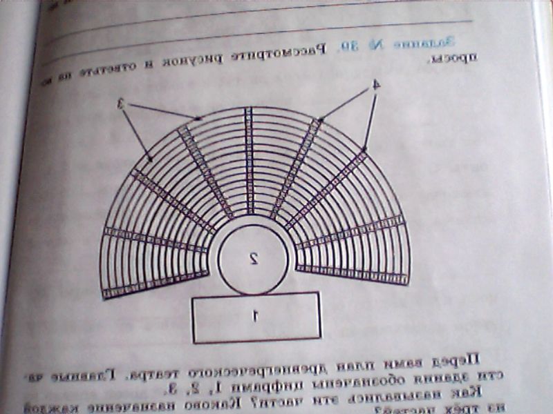 Перед вами план древнегреческого театра. Главные части здания обозначены цифрами 1, 2, 3.
