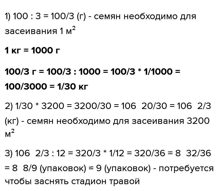 территорию стадиона необходимо засеять газонной травой. в одной упаковке газонной травы содержится 12 кг семян, при этом для засеивания 3м² необходимо 100г семян. какое количество упаковок газонной травы необходимо приобрести?