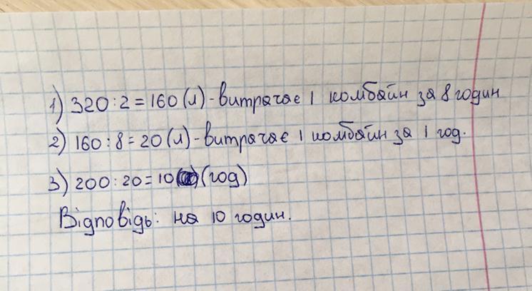 За 8 год роботи 2 комбайни витрачають 320 л пального. На скільки годин роботи вистачить 200 л одному такому KOMбайнy?