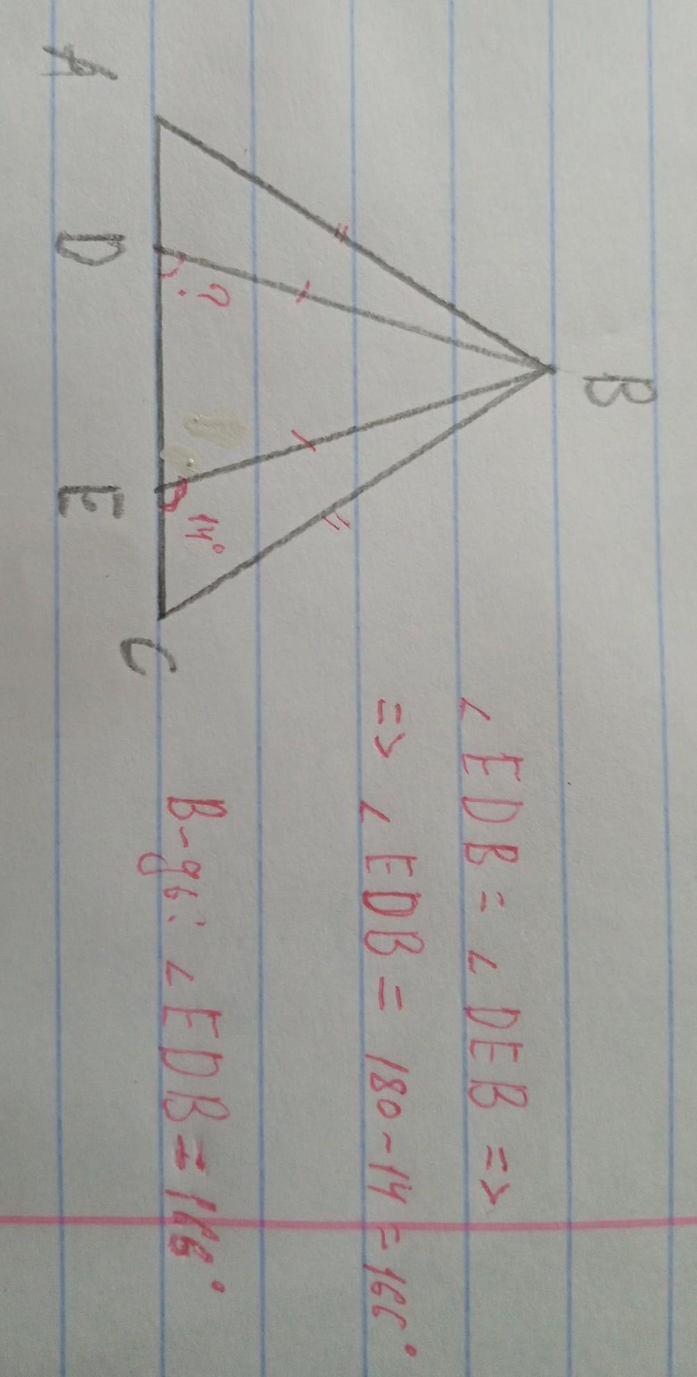 У рівнобедреному трикутнику ABC із бічними сторонами AB=BC на його основі взято точки D і E так, що AD=EC. Визнач ∠EDB, якщо ∠CEB=14