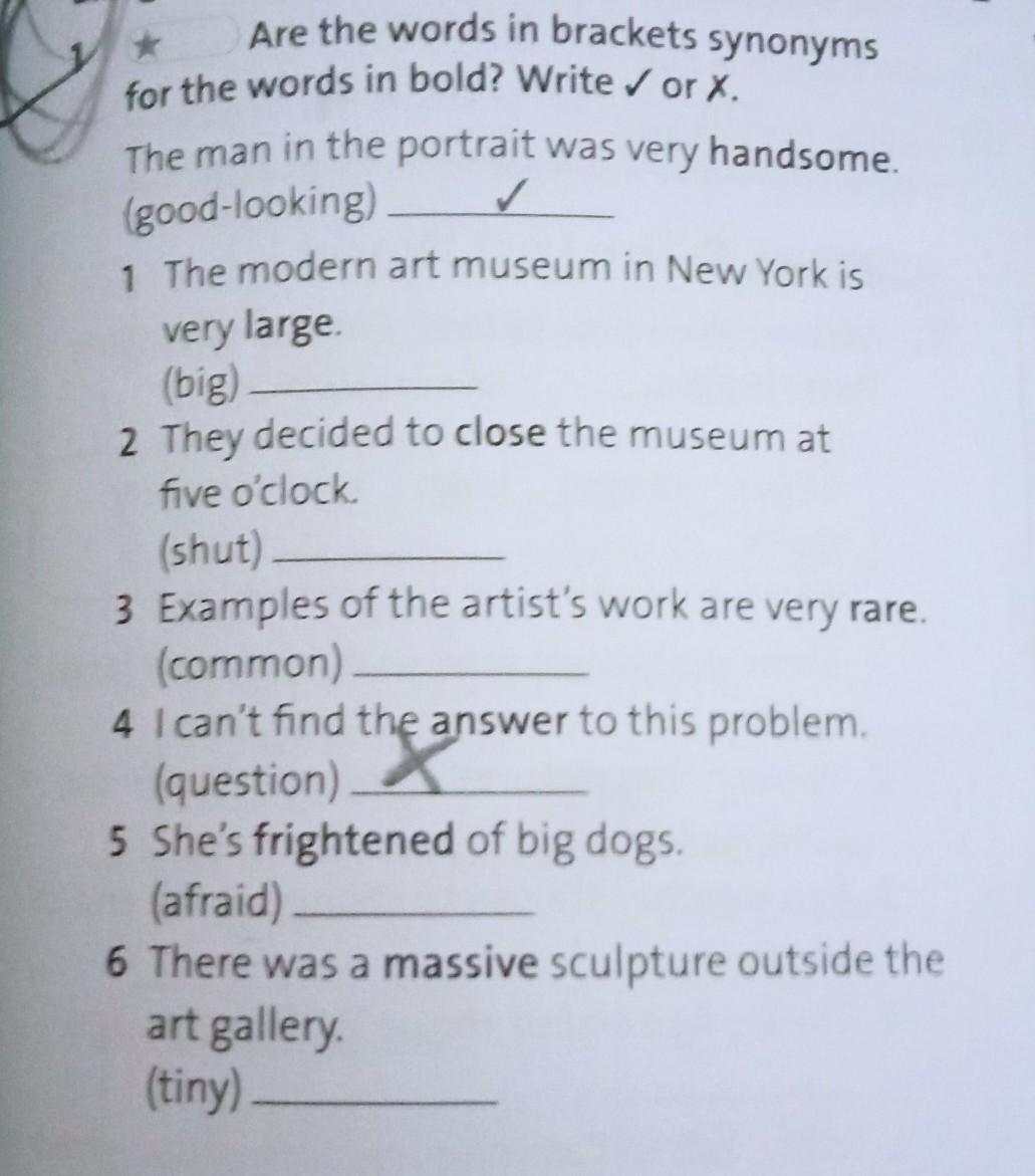 Are the words in brackets synonyms for the words in bold? Write ✓ or X. The man in the portrait was very handsome. ✓ (good-looking). 1 The modern art museum in New York is very large. (big). 2 They decided to close the museum at five o'clock. (shut). 3 Examples of the artist's work are very rare. (common) 4 I can't find the answer to this problem. (question) 5 She's frightened of big dogs. (afraid) 6 There was a massive sculpture outside the art gallery. (tiny).
