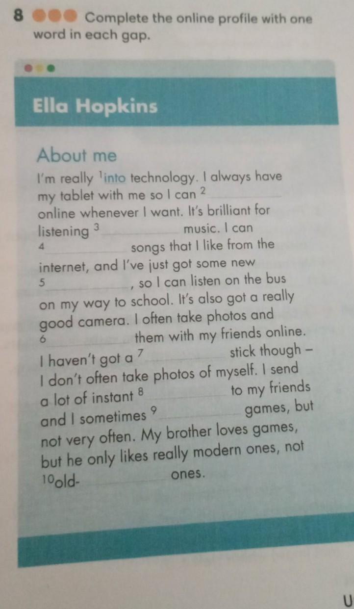 8 Complete the online profile with one word in each gap. Ella Hopkins About me I'm really into technology. I always have my tablet with me so I can 2 online whenever I want. It's brilliant for listening 3 4 music. I can songs that I like from the internet, and I've just got some new so I can listen on the bus 5 on my way to school. It's also got a really good camera. I often take photos and 6 them with my friends online. stick though- 7 I haven't got a I don't often take photos of myself. I send a lot of instant 8 to my friends 9 and I sometimes games, but not very often. My brother loves games, but he only likes really modern ones, not 10old- ones.
