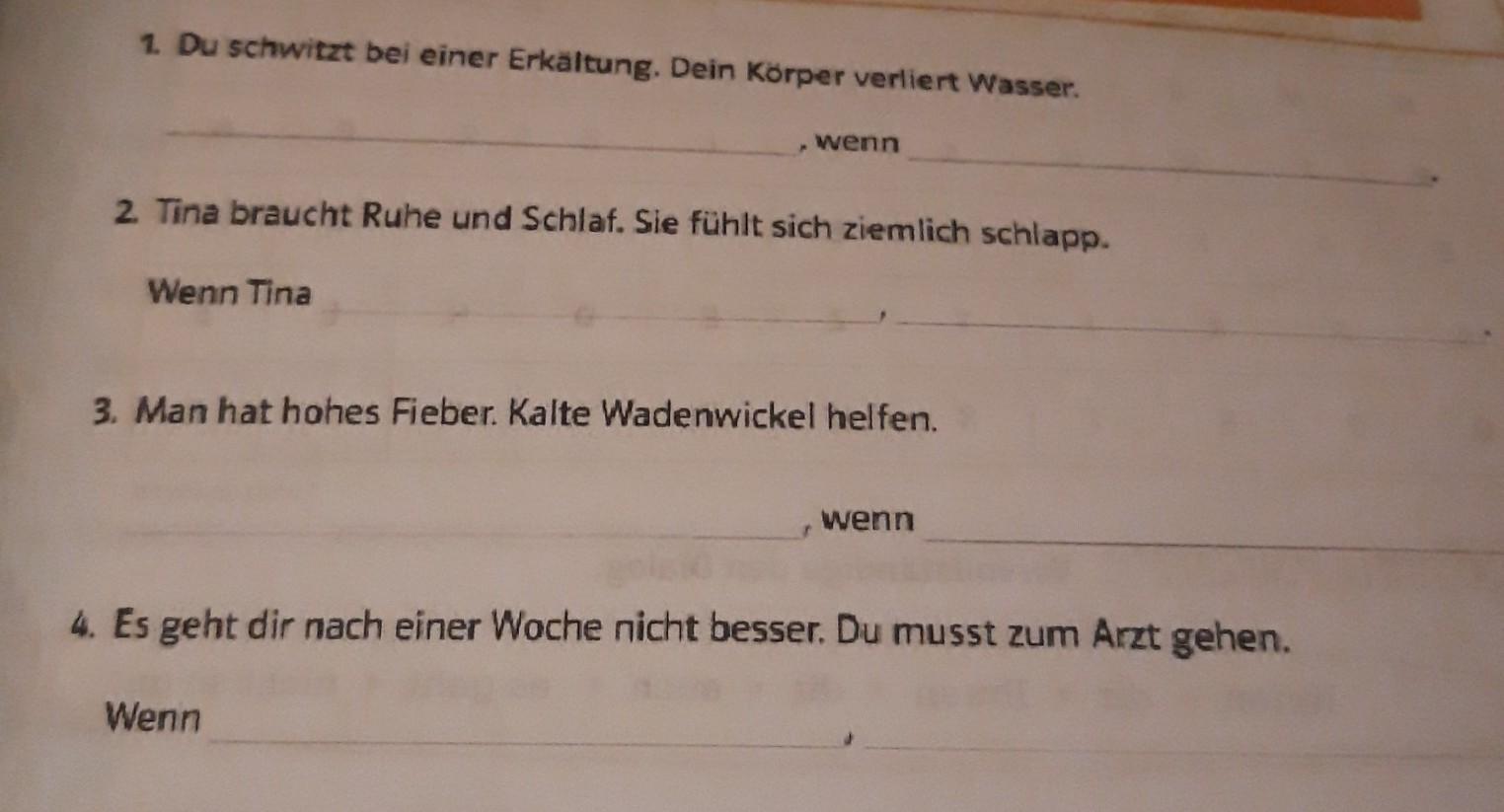 1. Du schwitzt bei einer Erkältung. Dein Körper verliert Wasser. 2. Tina braucht Ruhe und Schlaf. Sie fühlt sich ziemlich schlapp. Wenn Tina , 3. Man hat hohes Fieber. Kalte Wadenwickel helfen. Wenn wenn 4. Es geht dir nach einer Woche nicht besser. Du musst zum Arzt gehen.