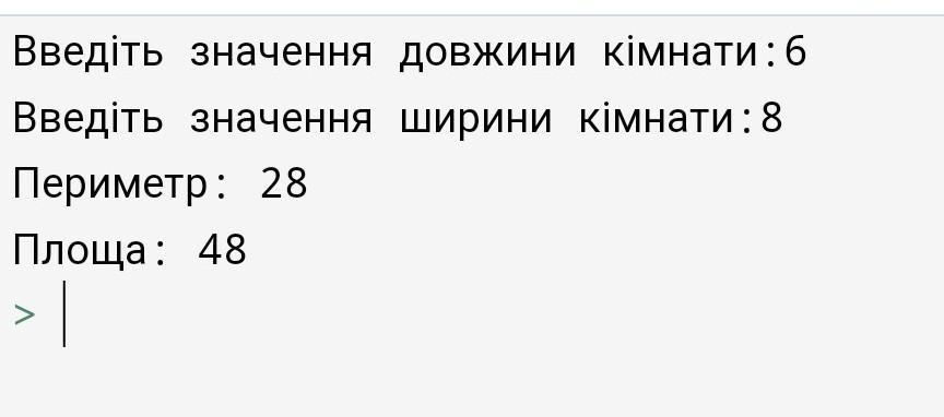 3 клавіатури вводимо довжину та ширину кімнати. Знайти її периметр та площу