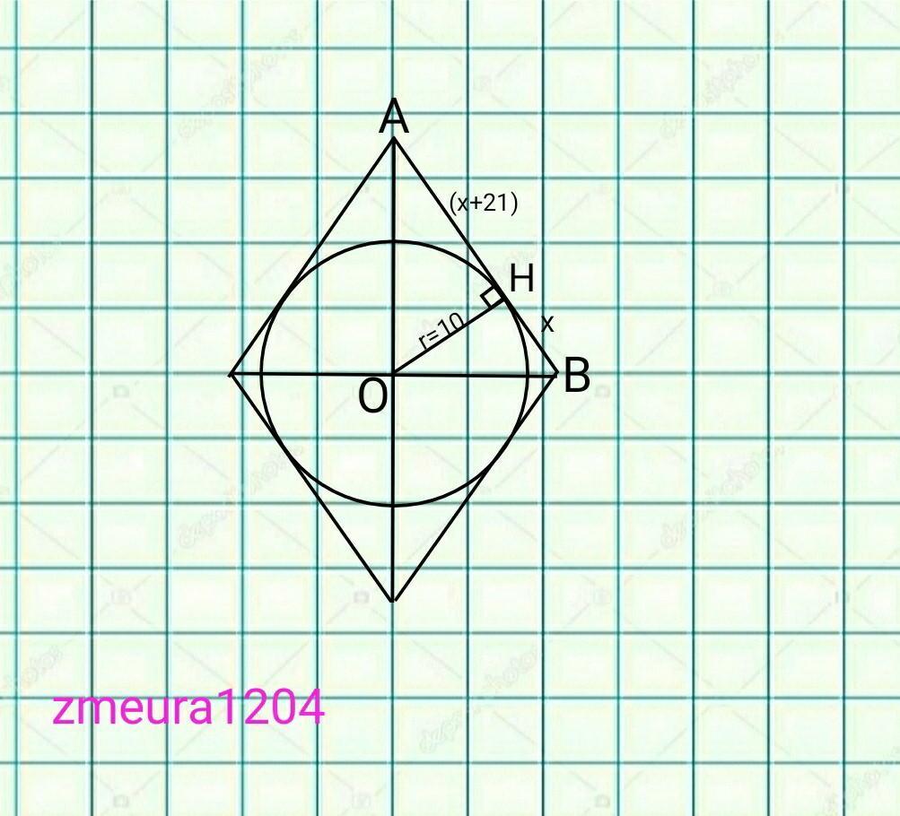 ромба до його сторони, ділить цю сторону на відрізки, один із яких на 21 см більший за інший. Знайдіть периметр ром- ба, якщо радіус вписаного в нього кола дорівнює 10 см.