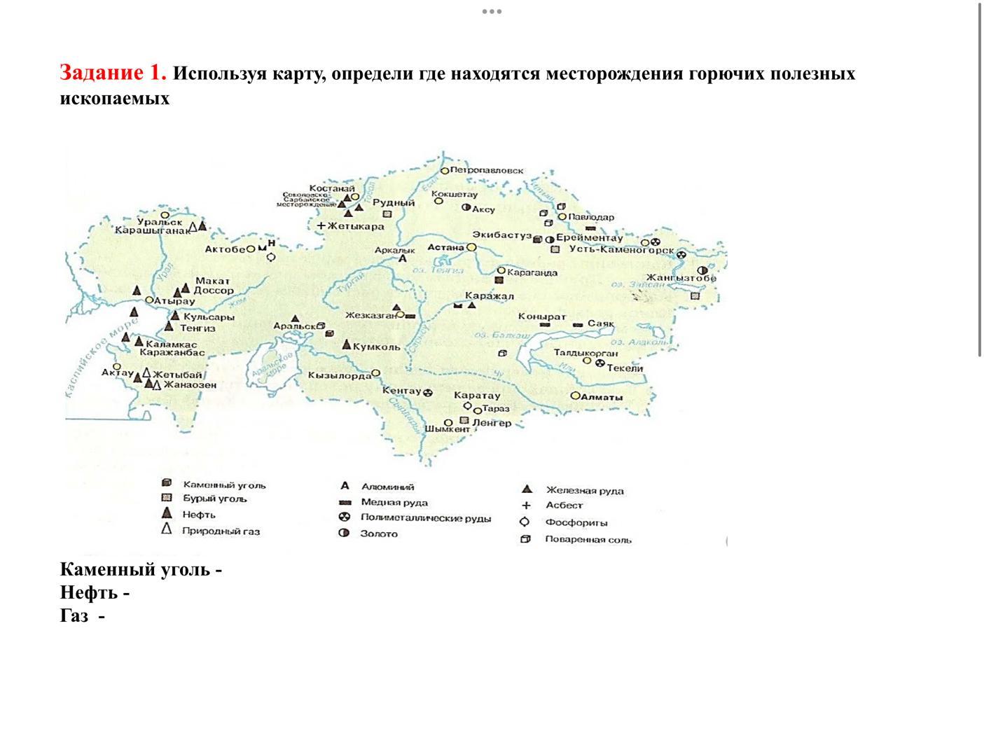 Задание 1. Используя карту, определи где находятся месторождения горючих полезных