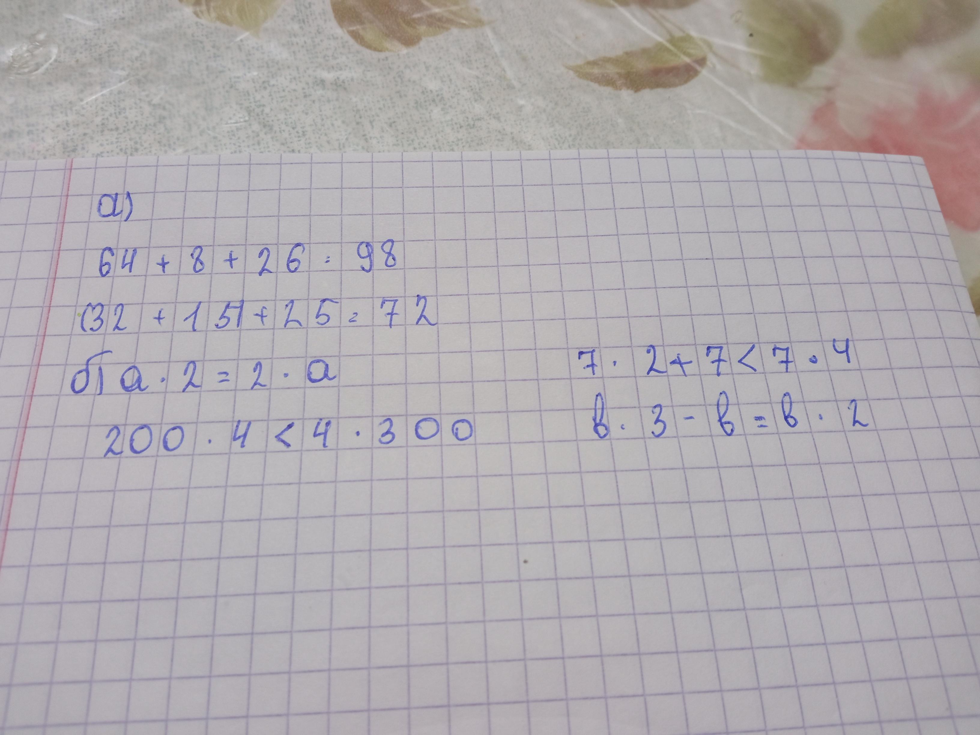 8. а) Найди значения выражений. 64 +8+26 б) Сравни. a. 2 * 2 . a 200-4*4-300 (32 + 15) + 25 7:2+7*7.4 b.3-bb.2 помогите пожалуйста