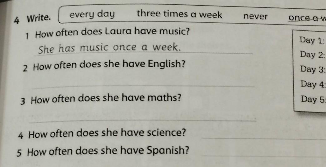 пж срочно нужно дам 10балов 1 How often does Laura have music? She has music once a week. 2 How often does she have English? 3 How often does she have maths? 4 How often does she have science? 5 How often does she have Spanish?