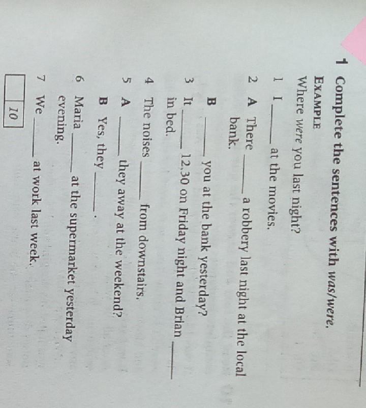 1 Complete the sentences with was/were. EXAMPLE Where were you last night? 1 I at the movies. 2 A There bank. B you at the bank yesterday? 3 It_______ 12,30 on Friday night and Brian in bed. 4 The noises___________ from downstairs. 5 A they away at the weekend? B. Yes, they a robbery last night at the local 6 Maria 10 at the supermarket yesterday evening. 7 We__________ at work last week.