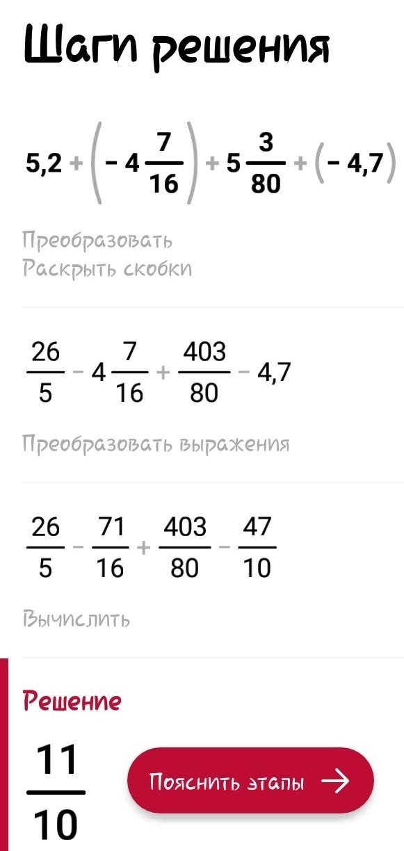6 ) . . . = 0,5 + ( 4 83/80 + (- 4 35/80 ) ) = 1/2 + 48/80 = 11/10 = 1 1/10 .