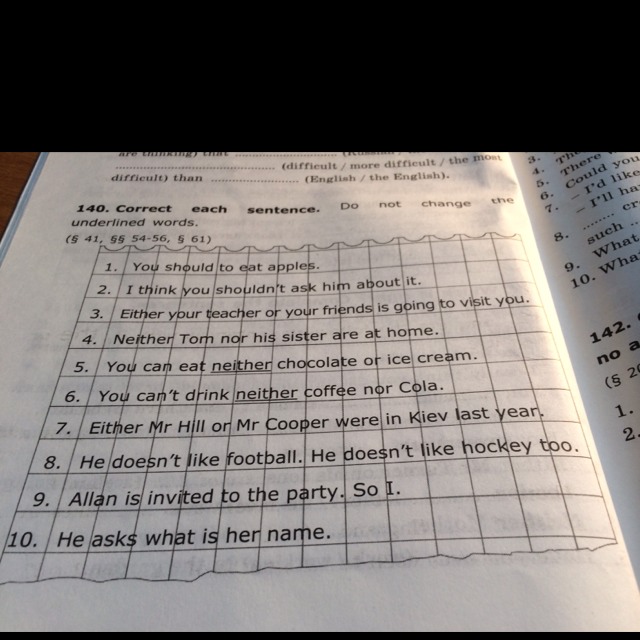 1You should eat apples2+3Neither your teacher nor your friends are going...4...nor ice-cream 5is at home6can drink7Neither ...nor8hockey either9 so am I10what her name is