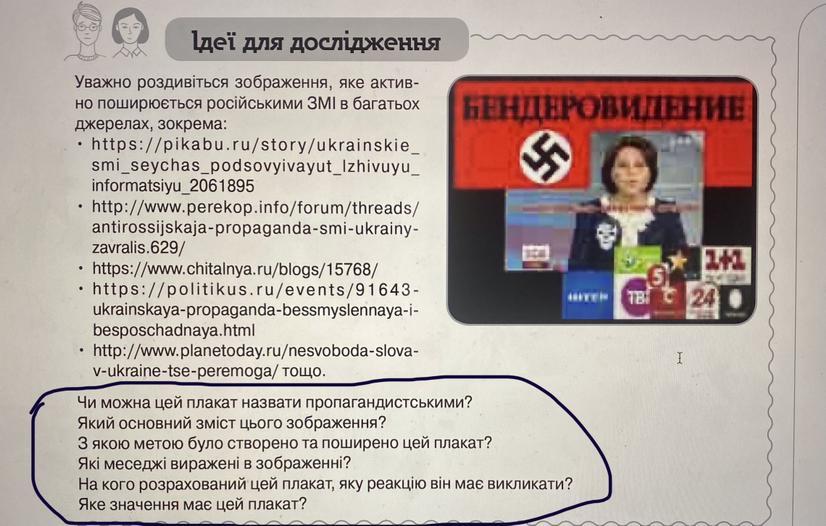 Можно ли назвать этот плакат пропагандистским? Да, можно. Каково основное содержание этого изображения? На плакате изображена телеведущая в виде вампира, логотипы телевизионных вещателей, крупная надпись «банд-ие», небольшая надпись «есть такая профессия - …», нацистская свастика. Какие месседжи выражены в изображении? Манипулятивное влияние медиа, что СМИ лгут. На кого рассчитан этот плакат, какую реакцию он должен вызвать? На всех, кому это может быть интересно. Реакция - осуждение.Какое значение имеет этот плакат? Создание конфликтных ситуаций в обществе.