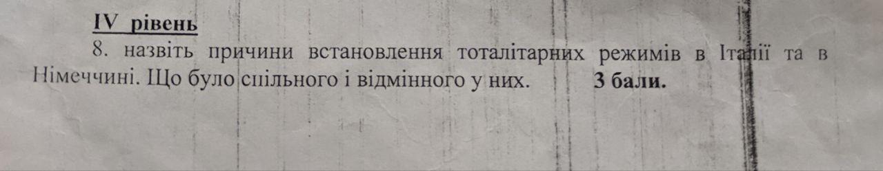 Назвіть причини встановлення тоталітарних режимів в Італії та в Німеччині. Що було спільного і відмінного у них.