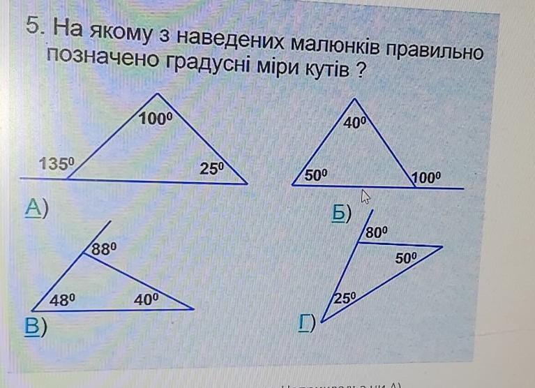 5. На якому з наведених малюнків правильно позначено градусні міри кутів ? 135⁰ A) 48⁰ 88⁰ 100⁰ 40⁰ 25⁰ 50⁰ 40⁰ Б) 250 80⁰ 100⁰ 50⁰ даю 65 балів