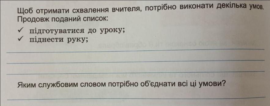 службове слово "і". Воно буде означати, що всі перераховані умови повинні бути виконані, щоб отримати затвердження вчителя. Приклад: "Щоб отримати затвердження вчителя, необхідно підготуватися до уроку і підняти руку".