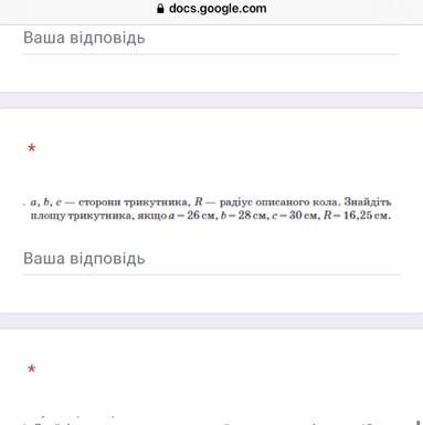 площу трикутника, якщо а=26 см, b = 28 см, с = 30 см, R=16,25 cm.