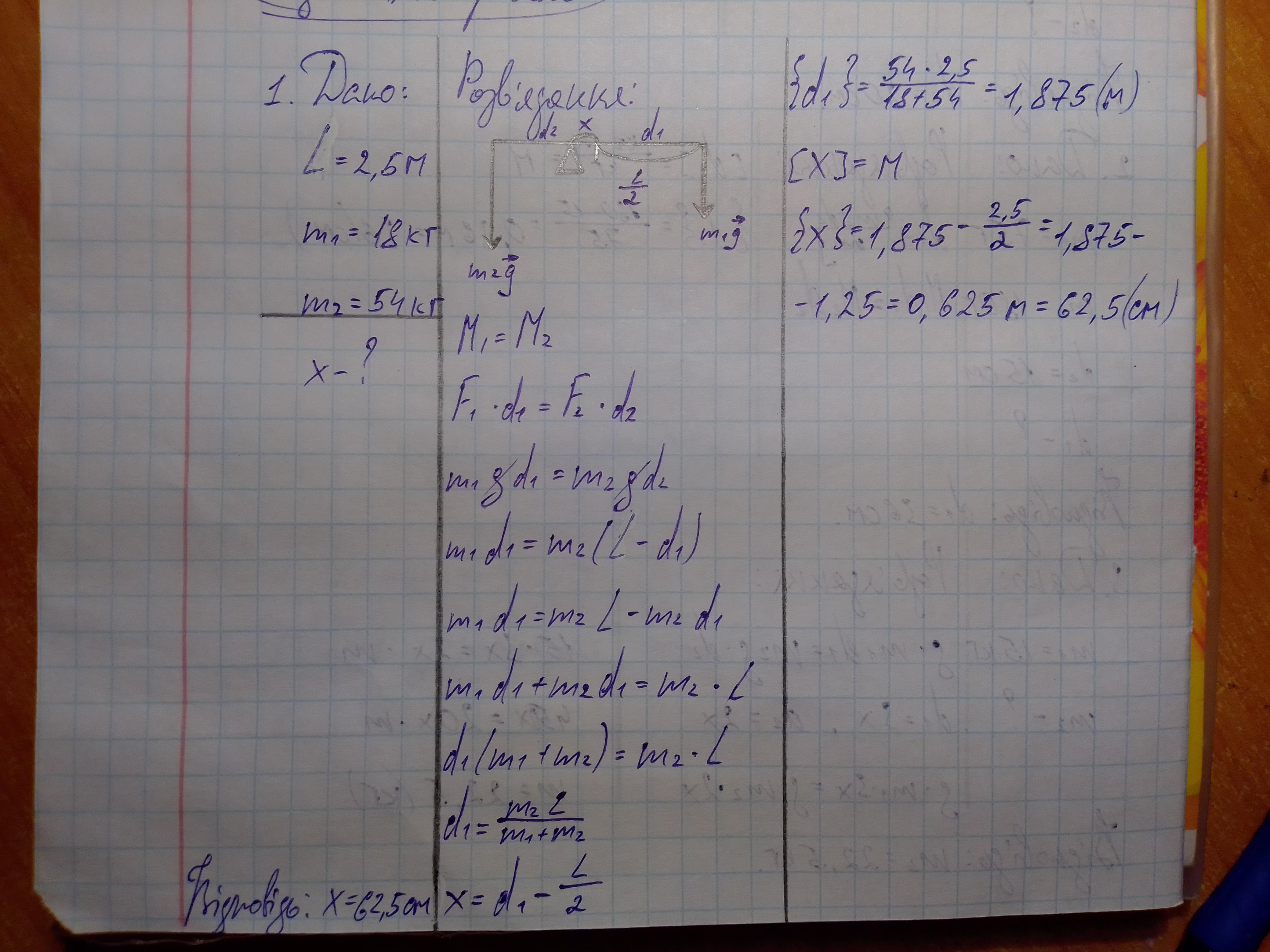 До кінців легкого однорідного стрижня, довжина яко-го 2,5 м, підвішено вантажі, маси яких т, =18 кг і m, =54 кг. На якій відстані від середини стриж-ня мае бути опора, щоб стрижень перебував у рівно-вазі?