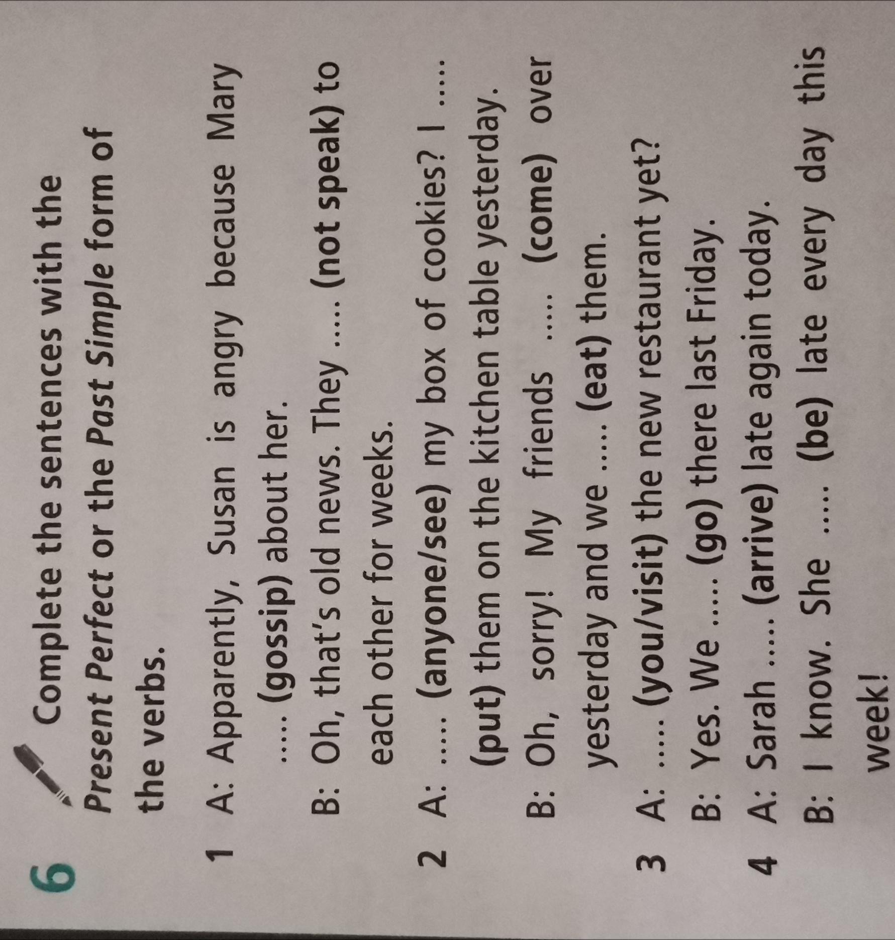 4. A : Sarah arrived late again today. B : I know . She has been late every day this week !