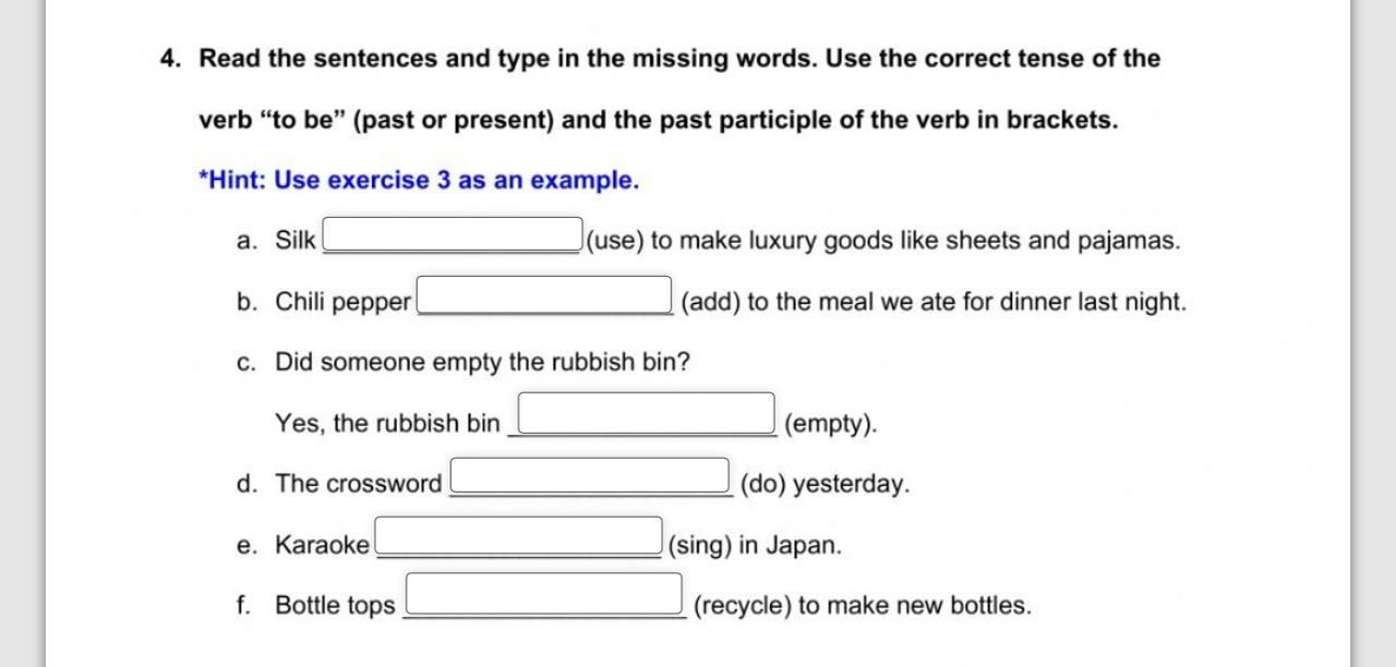 4. Read the sentences and type in the missing words. Use the correct tense of the