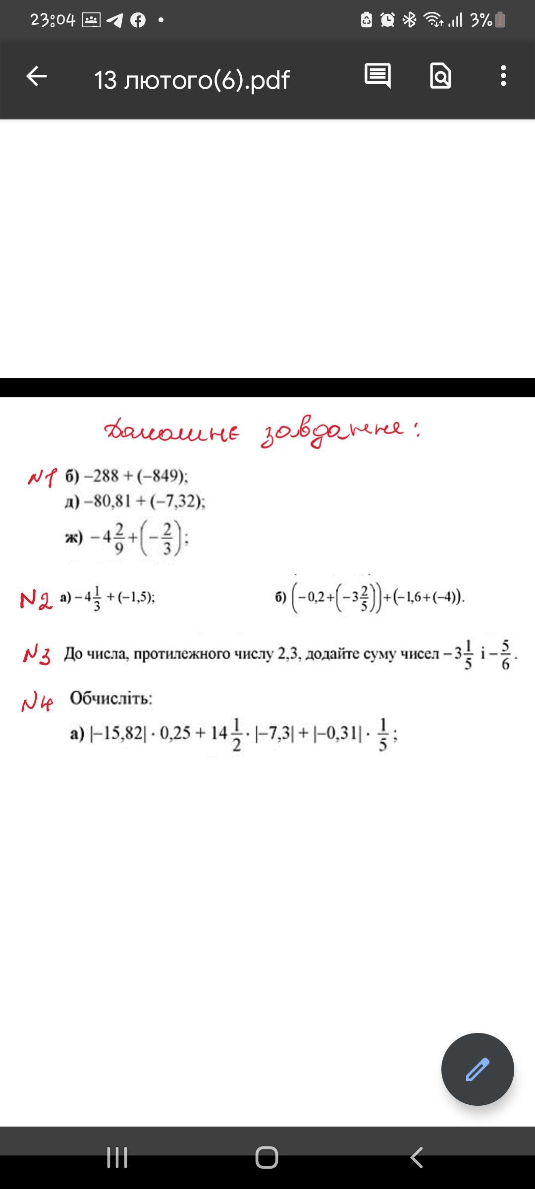а) -4 1/3 + (-1,5) = -(4 1/3 + 1,5) = -(4 1/3 + 1 1/2) = -(4 2/6 + 1 3/6) = -4 5/6