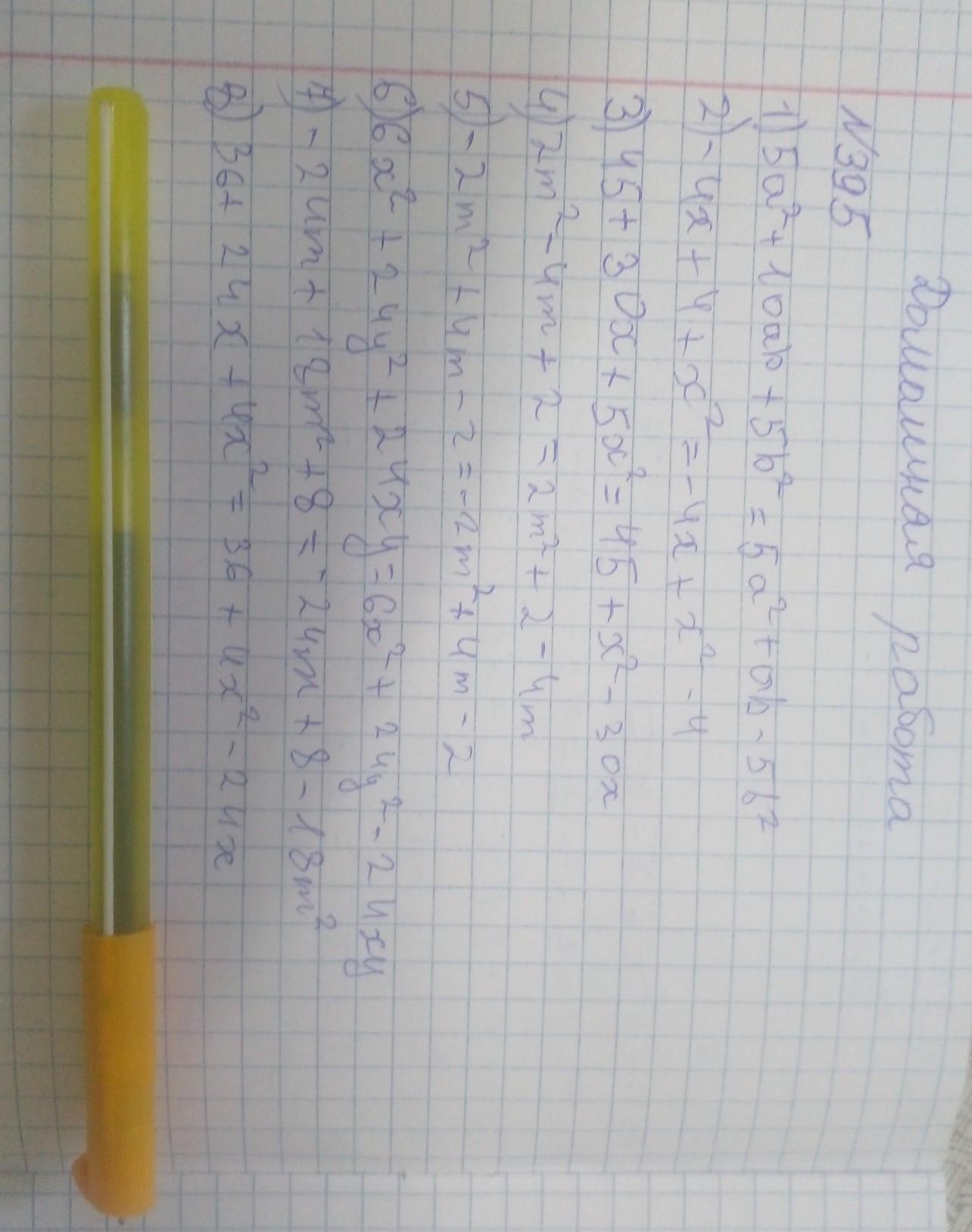 Разложите на множители (395-397). 395. 1) 5a² + 10ab +5b2; 2) -4x+4+x²; 3) 45 + 30x + 5x2; 4) 2m² - 4m + 2; 2) 24 5) -2m² + 4m -2; 6) 6x² + 24y² + 24ху 7) -24m + 18m² + 8; 8) 36 +24x+4x². 2 1 5)