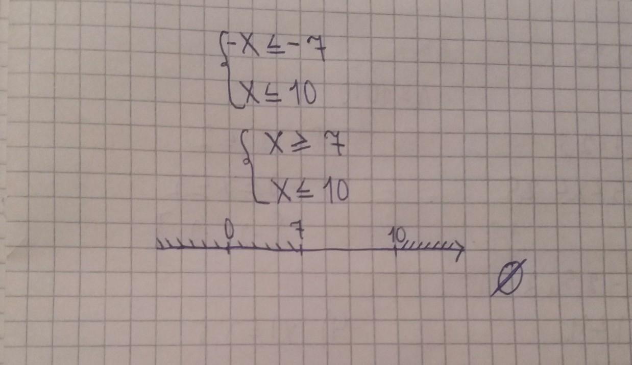 Сначала возьмем минус x. Когда мы берем минус x, мы получаем минус семь. Если в числе есть минус, то знак минус меняется на плюс. И десятка останется на месте. Наконец, мы делаем разметку на координатной балке. Будет пустой набор. Потому что десять разных частей, семь разных частей.