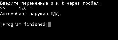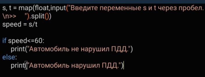 Автомобиль преодолел расстояние s км через населенный пункт в t мин. Определить, не нарушил ли водитель ПДД, если скорость автомобиля при этом не должна превышать 60 км/ч.