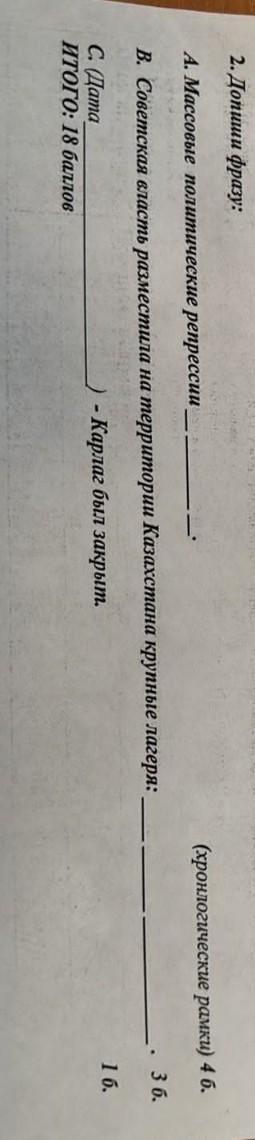 АНА 2. Допиши фразу: А. Массовые политические репрессии В. Советская власть разместила на территории Казахстана крупные лагеря: Карлаг был закрыт. С. (Дата ИТОГО: 18 баллов - (хронлогические рамки) 4 б. 3 б. 16.