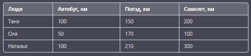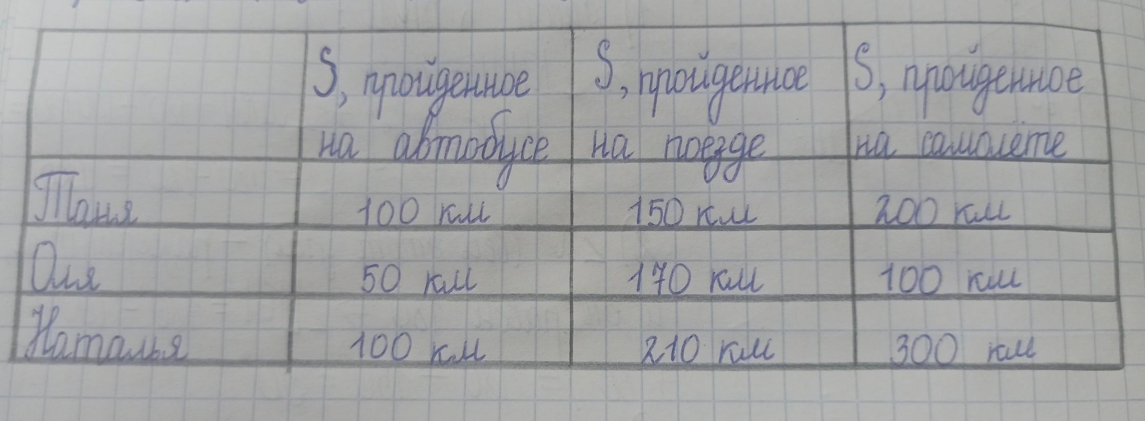 Таня, Оля и Наталья в период летних каникул путешествовали по стране. Таня проехала на автобусе 100 км, на поезде – 150 км, пролетела на самолете – 200 км. Оля проехала на поезде 170 км, на автобусе – 50 км, пролетела на самолете – 100 км. Наталья пролетела на самолете 300 км, проехала на поезде – 210 км, на автобусе – 100 км.