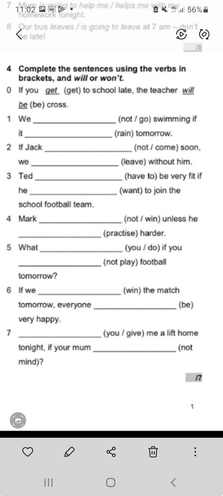 Ответ:1 won't go,rains 2 doesn't come,will leave 3 will have to,wants 4 won't win, practises 5 will you do,don't play 6 win,will be 7 Will you give,minds