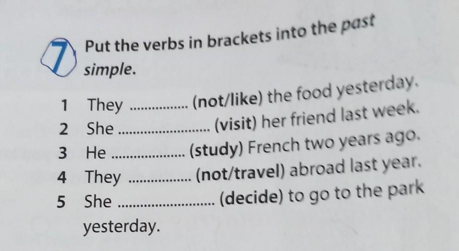 Ответ 1) don't like 2) visited 3) studied 4) don't travel 6) she decided