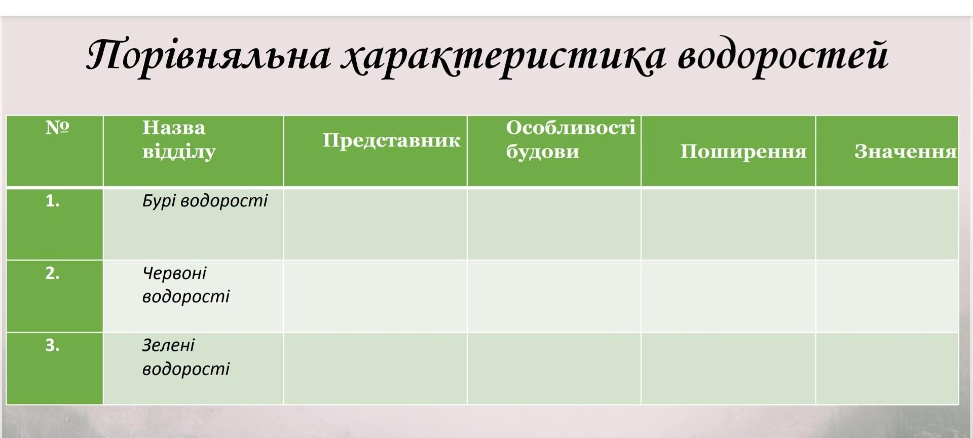 представники бурих водоростей –навікула, пінуляріяпорфіра, коралінафукус, макроцистісульва, хлорелаНавікула та пінулярія – діатомові водорості; порфіра, кораліна – червоні, а ульва та хлорела – зелені.