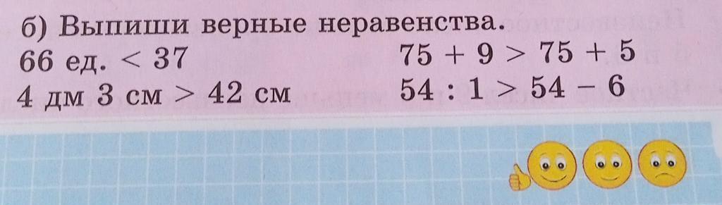 б) Выпиши верные неравенства. 66 ед. < 37 4 дм 3 см > 42 см 75 +975 +5 541 54 - 6 53