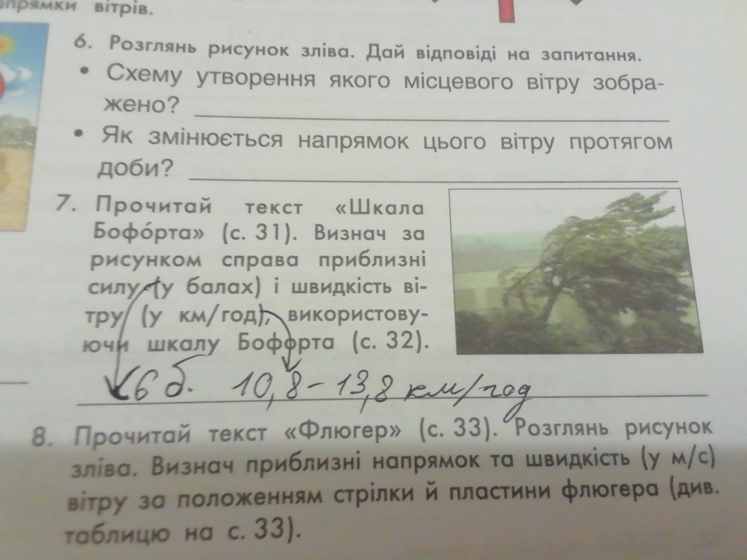 7. Прочитай текст «Шкала Бофорта» (с. 31). Визнач за рисунком справа приблизні силу (у балах) і швидкість ві- тру (у км/год), використову- ючи шкалу Бофорта (с. 32).