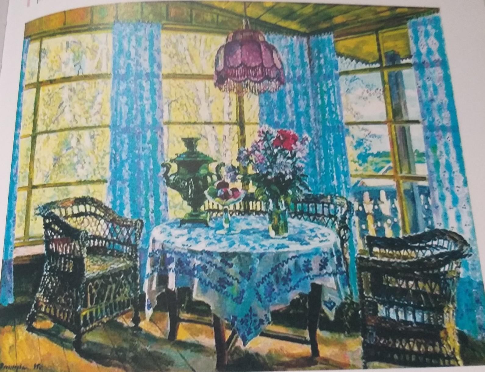 Картина переносит нас в большую светлую комнату дома Александра Сергеевича. Композиция выстроена по направлению из угла комнаты. В углу комнаты на заднем плане камин выложенный плиткой. Вероятно, погода за окном очень теплая – камин не затоплен, не видно золы и пепла, вероятнее всего лето или осень. Комната не переполнена мебелью