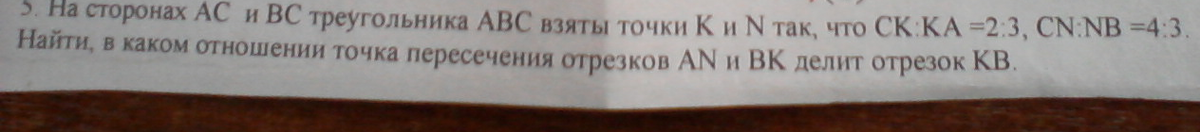 На сторонах AC и BC треугольника ABC взяты точки K и N так, что CK:KA=2:3, CN:NB=4:3. Найти, в каком отношении точка пересечения отрезков AN и BK делит отрезок KB.