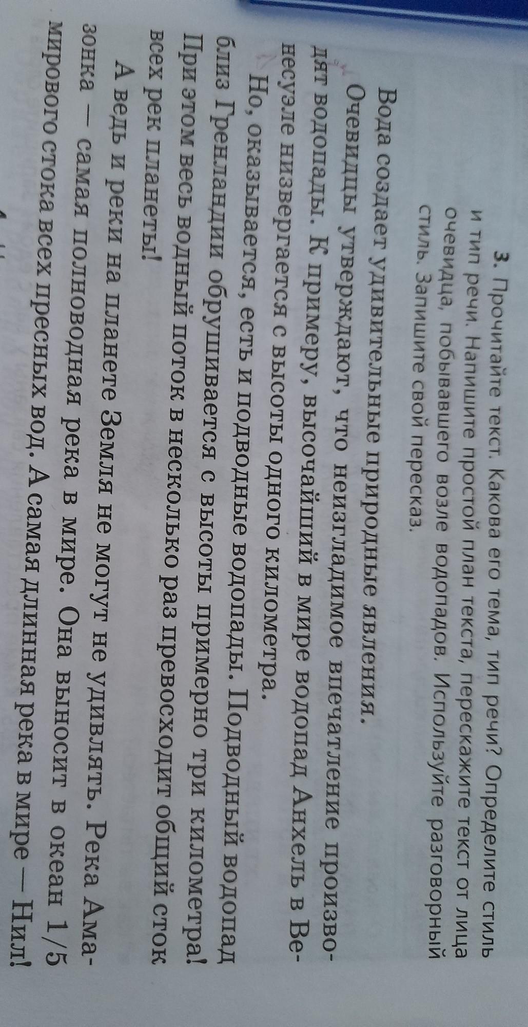 3. Прочитайте текст. Какова его тема, тип речи? Определите стиль и тип речи. Напишите простой план текста, перескажите текст от лица очевидца, побывавшего возле водопадов. Используйте разговорный стиль. Запишите свой пересказ