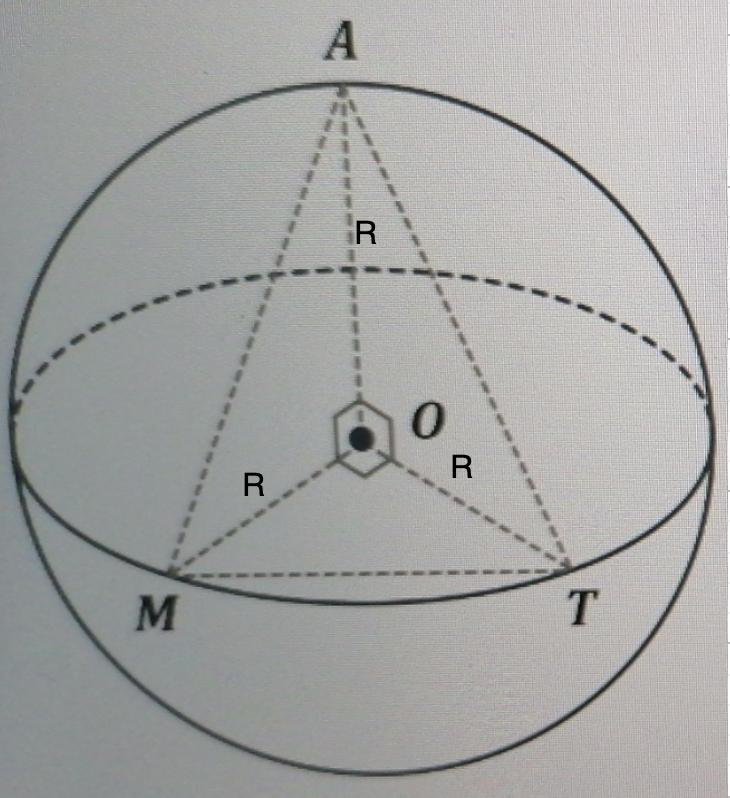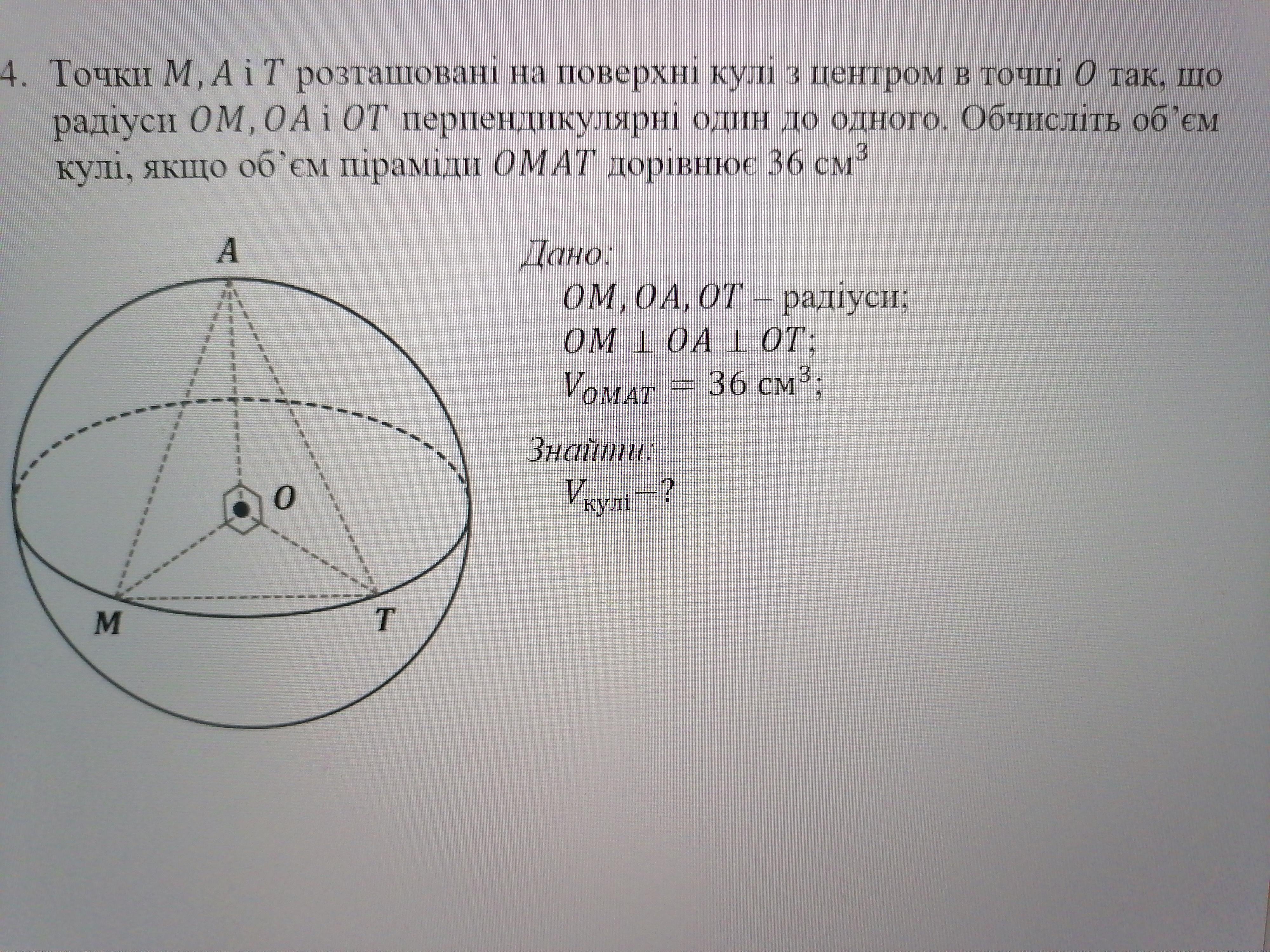 4. Точки M, A и T, расположенные на поверхности шара с центром в точке о так, что радиусы OM, OA и ОТ перпендикулярны друг к другу. Вычислите объем шара, если объем пирамиды равен 36 см³.
