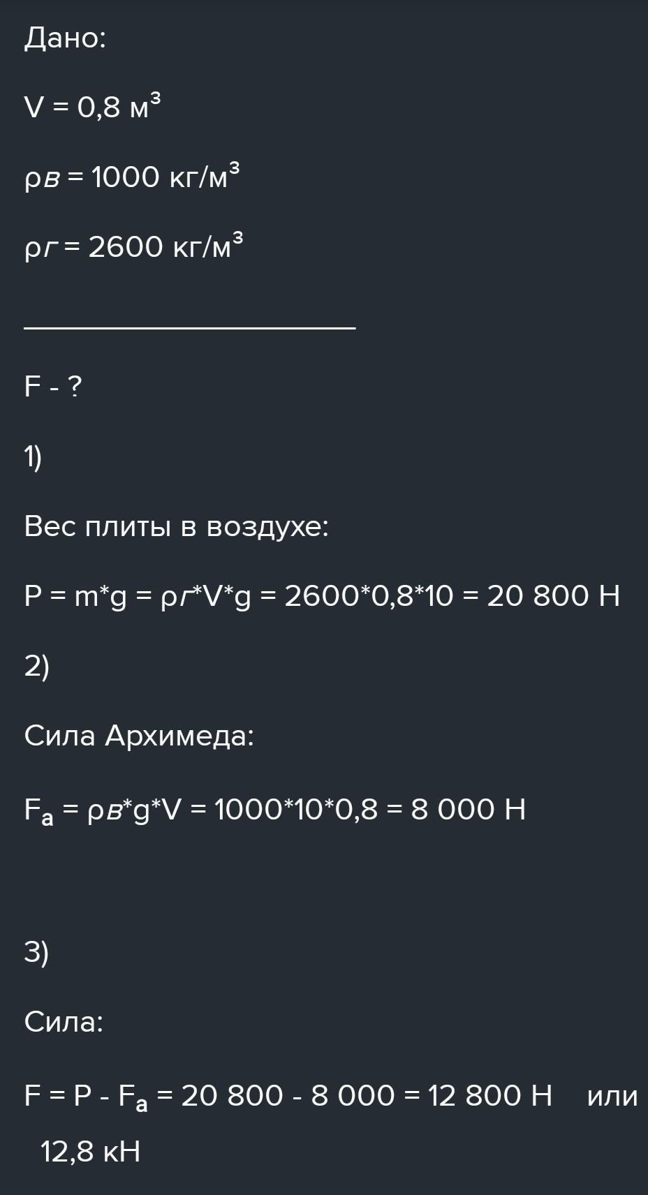 Какую силу надо приложить, что бы удержать в воде гранитную глыбу массой 1,3 тонны и объемом 0,5м^3.