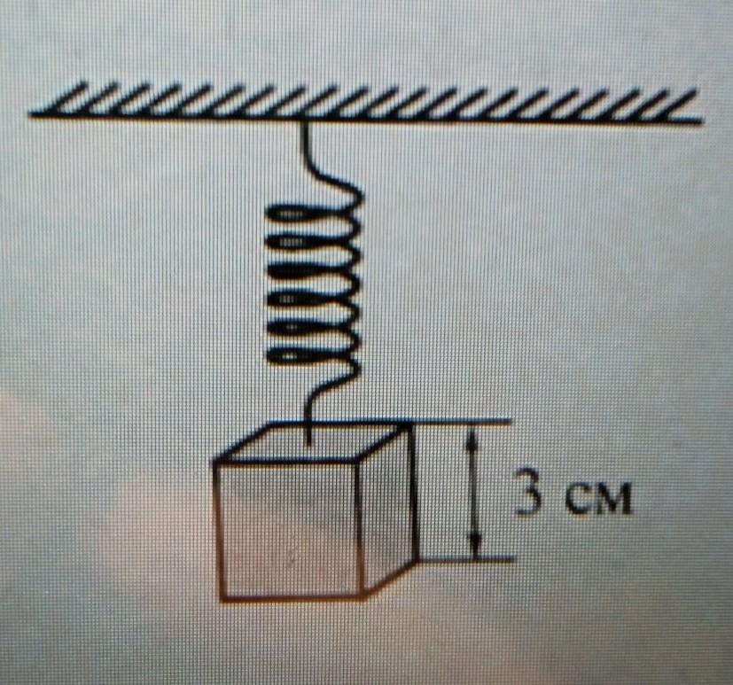 5. На пружині, жорсткість якої дорівнює 150 Н/м, висить кубик (див. рис.). Пружина при цьому видовжилась на 0,6 см.