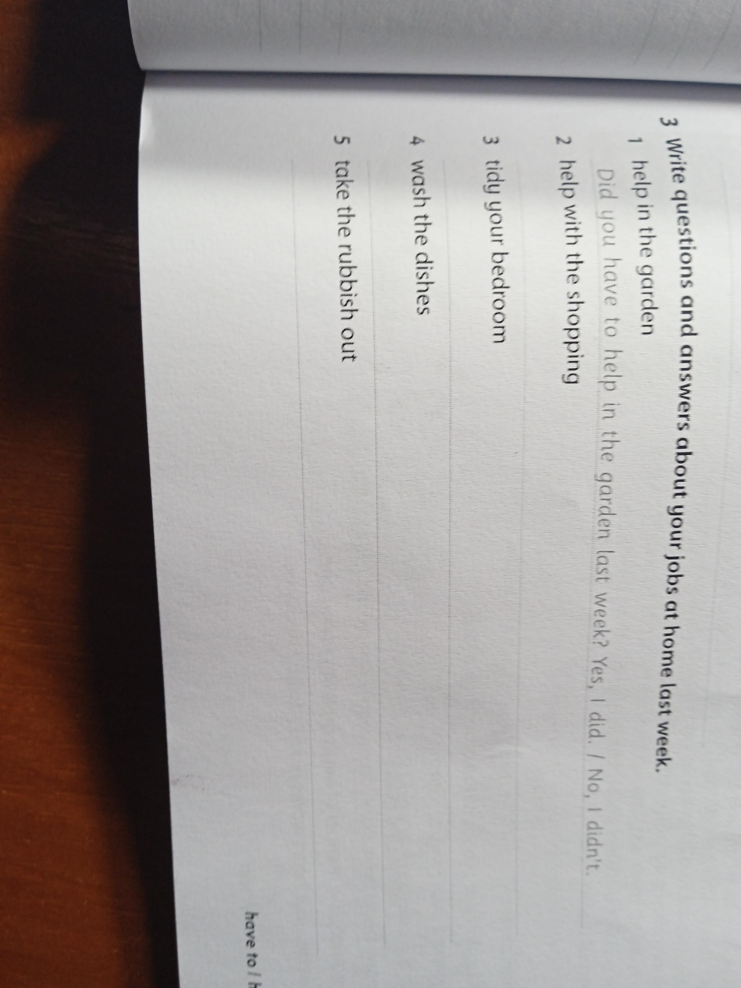 3)Did you tidy you bedroom?( Ты приводил(а) в порядок свою спальню?)( да ,приводил(а) = yes I tidy my bedroom/ Нет не приводил(а) = no I didn't tidy my bedroom) 4)Did you wash the dishes? (Ты помыл(а) посуду?)(да помыл(а)=yes I wash the dishes/нет не помыл(а)=no I didn't wash the dishes) 5)Did you take the rubbish out (ты выносил(а) мусор?)(да выносил(а)=yes I take the rubbish out/нет не выносил(а)=no I didn't take the rubbish out